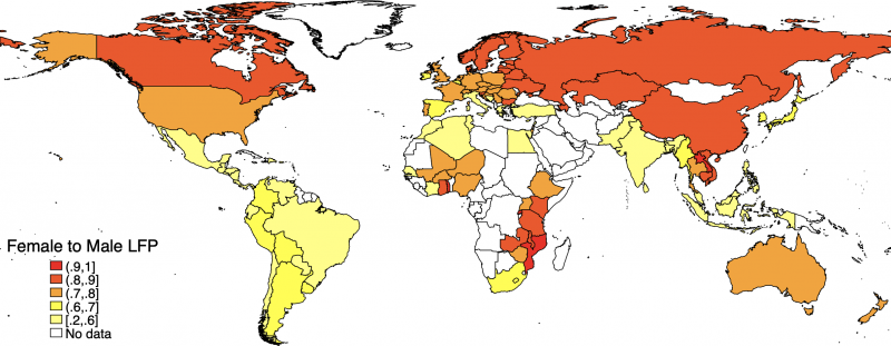 We combine the company administrative records with country-cohort data on labor force participation rates of males and females from the World Bank. In particular, we match the age cohorts in the firm with the average LFP rate in the country in the decade of labor market entry, separately by gender. For example, employees of age 18-29 are associated to the LFP rates of the 2010-2020 decade.