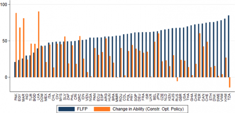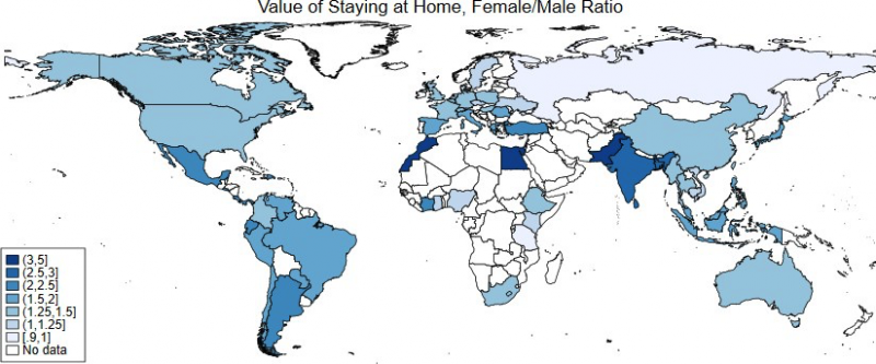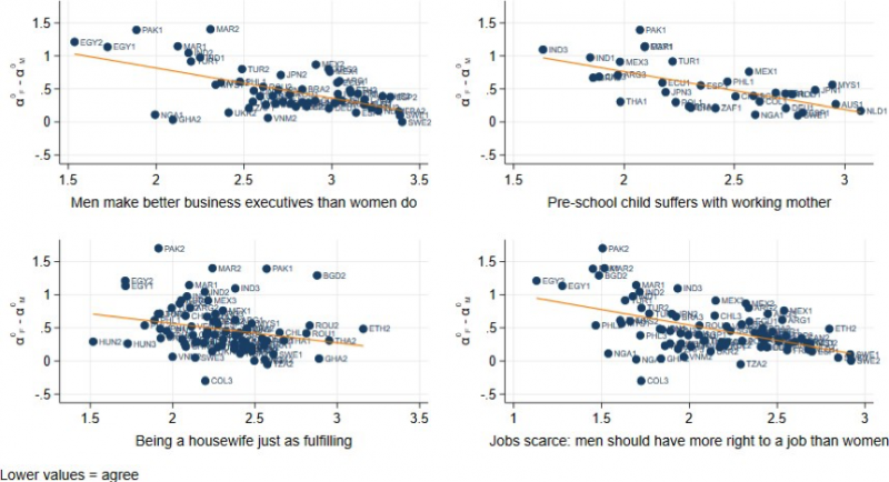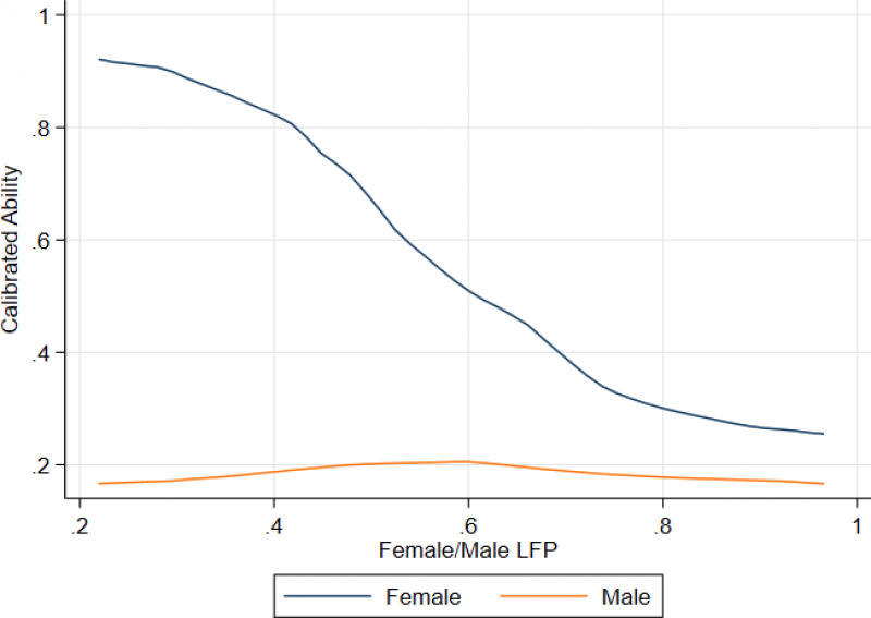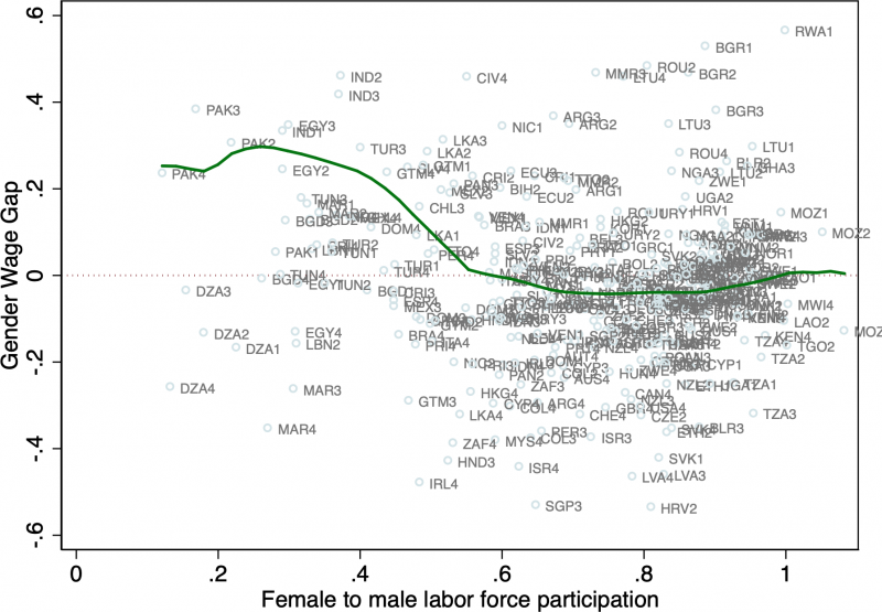 This method gives us a relationship that links salary in the MNE to the cost of working outside the home. Both variables have a component which is common to all people of the same gender in the same country, for instance: country-specific social norms about gender, and a component that is specific to the individual: their own talent and preferences. Because we have individual-level data on salary (from anonymised personnel data of thousands of employees of the same gender in the same country), we can separate the common component of salary from the reward to individual-specific performance. Likewise, because we have data on LFP across all countries, we can separate the common component of the cost to women working outside the home from the individual specific preferences.